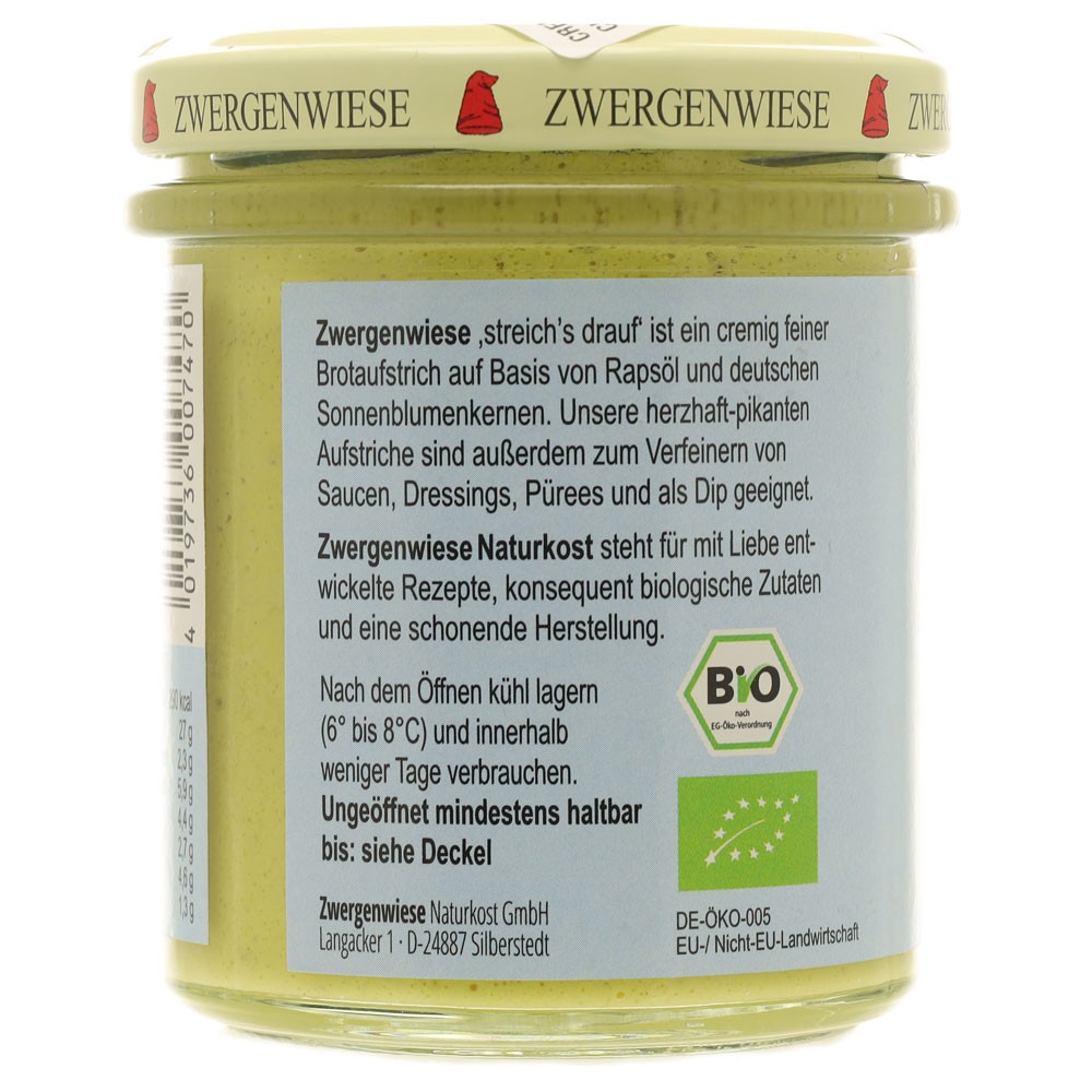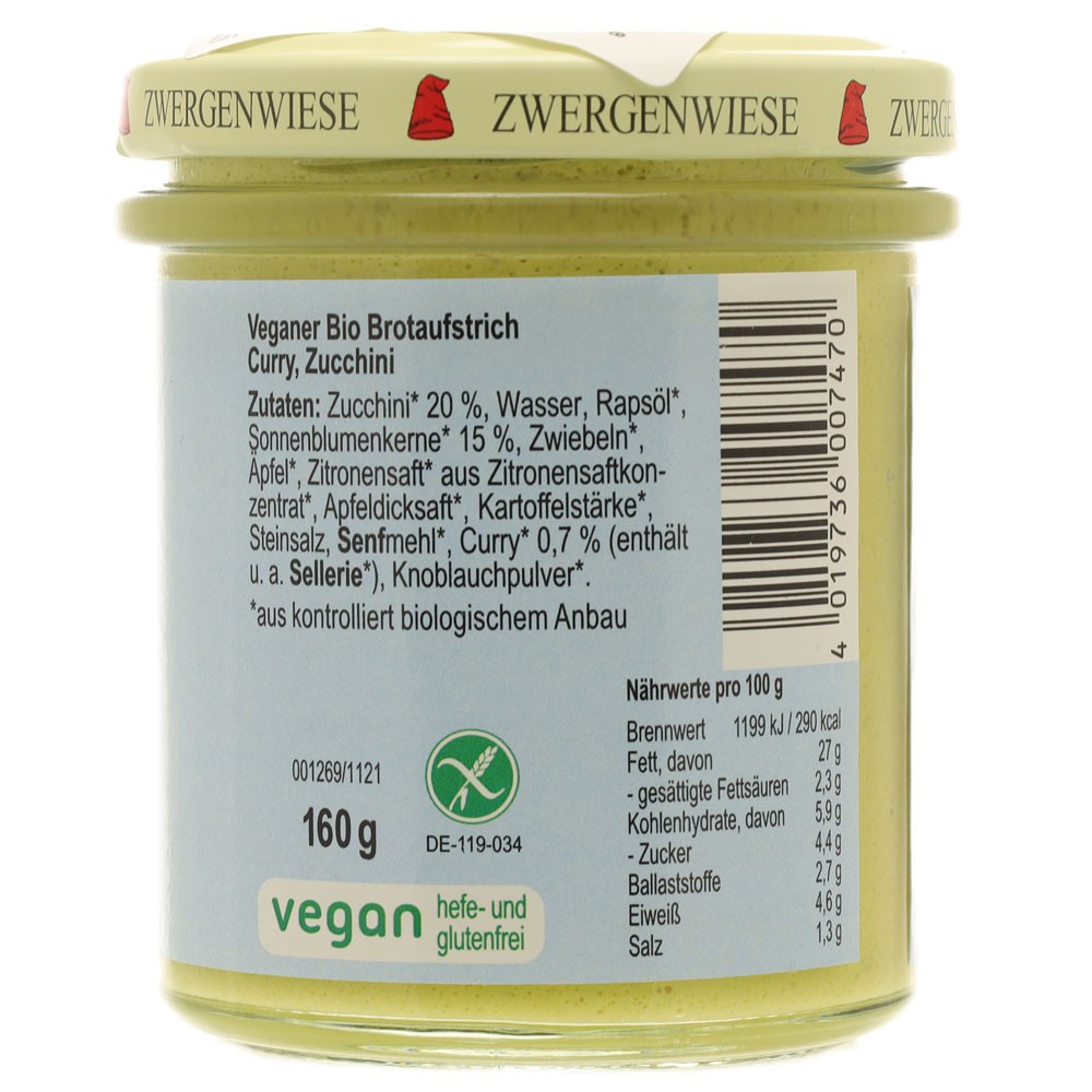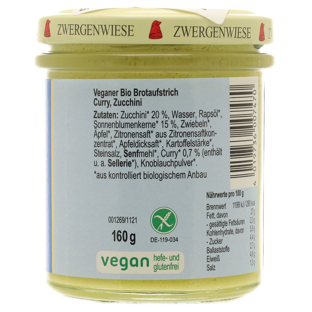 Crema tartinabila vegetala Currychini cu curry si zucchini bio FARA GLUTEN. 14 produse tartinabile cremoase- condimentate, picante si cu gust intensiv. Sunt potrivite pentru creeatii de sandwichuri, pentru gatit, pentru sosuri si rantasuri. Toate sortimentele sunt fără lactoză, fără drojdie si fără gluten. Zwergenwiese Naturkost este consecventa in fabricarea produselor cu materii prime ecologice, dupa retete regionale.