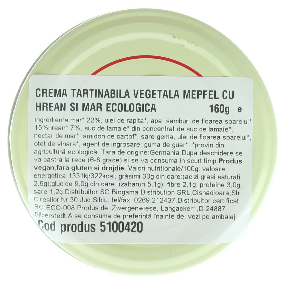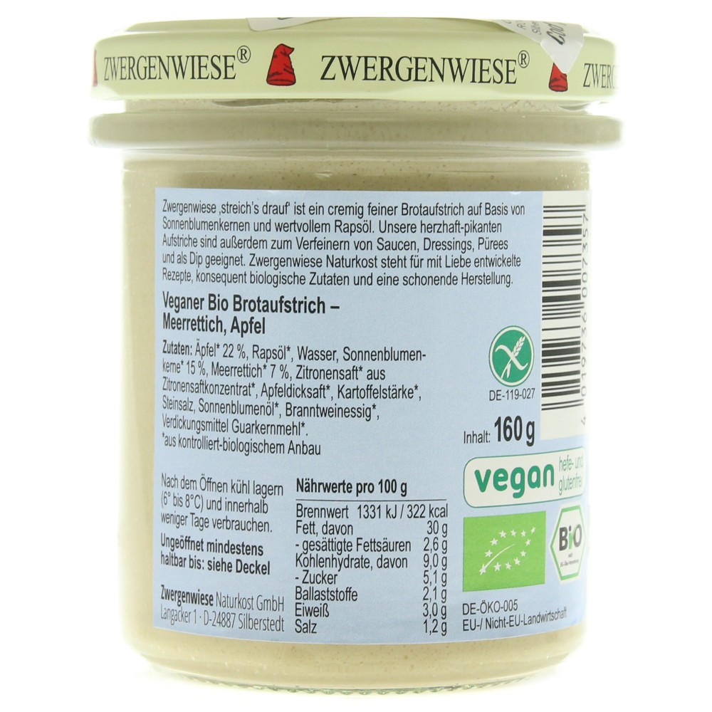Crema tartinabila vegetala bio Mepfel cu hrean si mar FARA GLUTEN. 14 produse tartinabile cremoase- condimentate, picante si cu gust intensiv. Sunt potrivite pentru creeatii de sandwichuri, pentru gatit, pentru sosuri si rantasuri.. Toate sortimentele sunt fără lactoză, fără drojdie si fără gluten. Zwergenwiese Naturkost este consecventa in fabricarea produselor cu materii prime ecologice, dupa retete regionale.