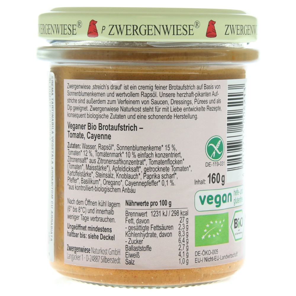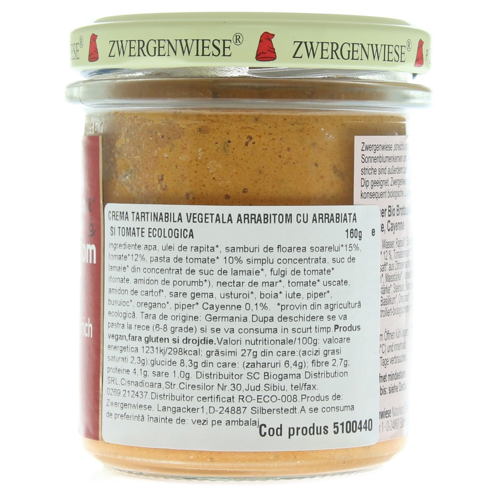 Cremă tartinabilă vegetală Arrabitom cu arrabbiata și tomate, Zwergenwiese este alegerea ideală pentru cei care iubesc gusturile intense și condimentate, într-o formulă bio, vegană și fără gluten. Inspirată de renumitul sos arrabbiata din bucătăria italiană, această cremă combină roșii ecologice, ardei iuți și condimente naturale, oferind o experiență gustativă explozivă.