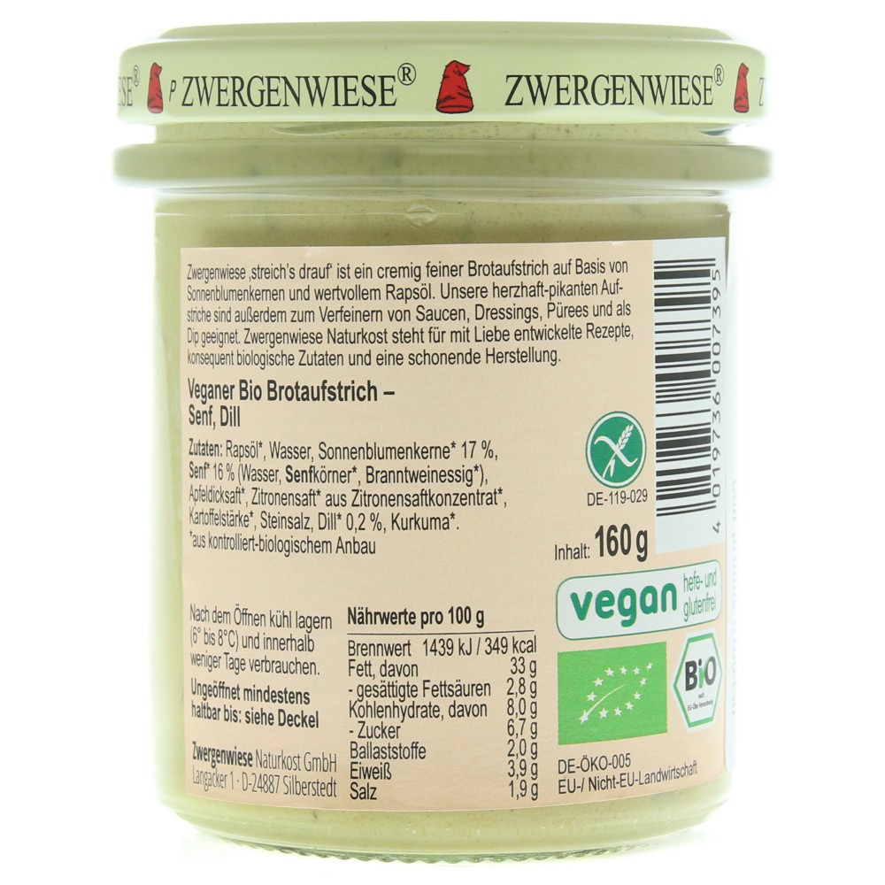 Crema tartinabila vegetala Sendi cu mustar si marar bio FARA GLUTEN. 14 produse tartinabile cremoase- condimentate, picante si cu gust intensiv. Sunt potrivite pentru creeatii de sandwichuri, pentru gatit, pentru sosuri si rantasuri. Toate sortimentele sunt fără lactoză, fără drojdie si fără gluten. Zwergenwiese Naturkost este consecventa in fabricarea produselor cu materii prime ecologice, dupa retete regionale.