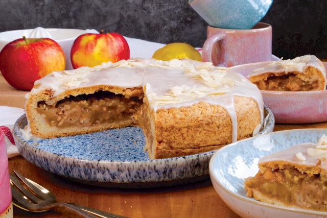 Se pune umplutura de mere. Peste aceasta se asează al doilea cerc de aluat și se unește la margini. În a doua bucată de aluat se face cruci mici, folosind un cuțit. Introduceți tava la cuptor timp de 60 de minute. Se scoate din cuptor, se lasă la răcit timp de 15 minute, se scote cu grijă din formă și se lasă mai departe la răcit.