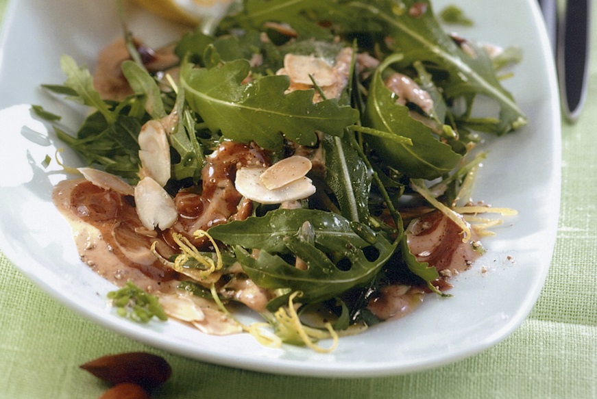 În funcție de gustul dumneavoastră se mai adaugă arpagic, se incorporează totul cu rucola și se ornează cu fulgi de migdale.